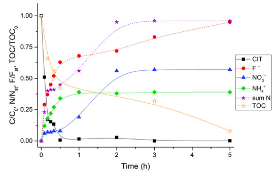Time evolution of primary process, end-inorganic products (nitrate, ammonium and fluoride) and organic carbon during the photocatalytic degradation of CIT (CIT 20 mgL−1, TiO2 400 mgL−1, the concentration of different species are normalized for the initial concentration (C/C0, TOC/TOC0) or for the stoichiometric amount (N/Nst and F/Fst); sum N represents the sum of nitrate and ammonium contribution).