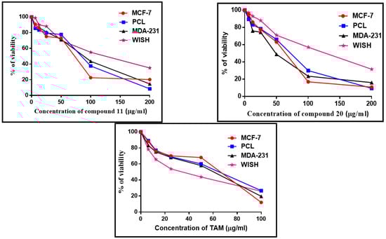 3.3.1. Cytotoxic Effect of Compounds 11, 20, and Tamoxifen (TAM)