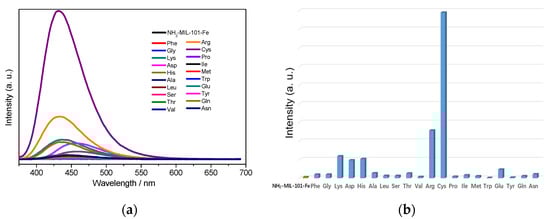 Next, in order to explore the sensing capacity of NH2-MIL-101-Fe and NH2-MIL-101-Al toward amino acids, their fluorescence emission spectra in the suspension of 20 kinds of different natural amino acids including Ala (L-alanine), Arg (L-arginine), Asn (L-asparagine), Asp (L-aspartic acid), Cys (L-cysteine), Glu (L-glutamic acid), Gln (L-glutamine), Gly (glycine), His (L-histidine), Ile (L-isoleucine), Leu (L-leucine), Lys (L-lysine), Met (L-methionine), Phe (L-phenylalanine), Pro (L-proline), Ser (L-serine), Thr (L-threonine), Trp (L-tryptophan), Tyr (L-tyrosine) and Val (L-valine) with a concentration of 0.1 M were recorded in the range of 375–690 and 360–660 nm excited at 356 and 340 nm, respectively. As depicted in Figure 1, it was worth noting that the emission of NH2-MIL-101-Fe was tremendously enhanced by Cys (up to 158 times), while significant increments in the emission intensities in the suspension of Lys (about 3.9 times), Arg (about 3.1 times) and His (about 2.5 times) could be observed for NH2-MIL-101-Al.