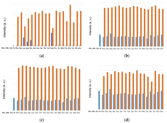 As we know, the anti-interfering capability is one of the most important evaluation criteria for sensing materials. Therefore, we carried out competing experiments through the first addition of other AAs in H2O followed by addition of Cys and Lys/Arg/His to the corresponding suspension of NH2-MIL-101-Fe and NH2-MIL-101-Al to verify their anti-interference. For NH2-MIL-101-Fe, the addition of all the other interfering amino acids had no significant effect on the sensing capability toward Cys except Lys, Asp, His and Arg (Figure 3a). It can be observed that the addition of Lys, Asp, His or Arg could also enhance the emission intensity of NH2-MIL-101-Fe, which only resulted in a limited increment in the emission intensity upon the successive addition of Cys. Meanwhile, it is clearly indicated in Figure 3b–d that the presence of other amino acids had no significant influence on the enhancing effect of Lys/Arg/His for the fluorescence emission intensities of NH2-MIL-101-Al. These phenomena implied that NH2-MIL-101-Fe exhibited reasonable anti-interference except Lys, Asp, His and Arg while NH2-MIL-101-Al could still be used for sensing Lys/Arg/His in the existence of other amino acids.