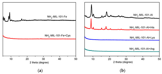 In addition, we also made efforts to investigate the sensing mechanism of NH2-MIL-101-Fe and NH2-MIL-101-Al toward specific amino acids. Generally, the primary concern of the sensing mechanism of MOFs is the structural stability of the sensing materials. Therefore, we employed PXRD to examine the stability of NH2-MIL-101-Fe and NH2-MIL-101-Al in the solution of amino acids. As shown in Figure 4, only the PXRD patterns of NH2-MIL-101-Al in the presence of His matched well with those of the as-synthesized sample, suggesting the structural stability of NH2-MIL-101-Al in the aqueous solution of His, while the PXRD peaks of NH2-MIL-101-Fe in the aqueous solution of Cys and NH2-MIL-101-Al in the aqueous solution of Lys/Arg all disappeared, indicating the collapse of the structures of NH2-MIL-101-Fe and NH2-MIL-101-Al. Therefore, it could be concluded preliminarily that the sensing capability of NH2-MIL-101-Fe toward Cys and of NH2-MIL-101-Al toward Lys and Arg could be attributed to the structural collapse and such mechanisms can be excluded for NH2-MIL-101-Al toward His. To further investigate the intrinsic reason, we speculate that it is the encapsulation of His into the pores of NH2-MIL-101-Al that causes the fluorescence emission intensity enhancement based on the investigation of our previous work [38]. Thus, we employed 1H NMR and FT-IR measurements to verify this speculation. After digesting in NaOH/ D2O, we measured the 1H NMR spectra of the untreated and His-treated NH2-MIL-101-Al in D2O, and the results are depicted in Figure S3. Compared to the 1H NMR spectra of NH2-MIL-101-Al, it could be found that some new peaks belonging to His appeared in that of His-treated NH2-MIL-101-Al (Figure S3a), suggesting the adsorption of His into the pores of NH2-MIL-101-Al. In addition, it could be observed that a new C-C stretching vibration band belonging to His around 1142 cm−1 appeared and the O-H stretching bands belonging to solvent water molecules were greatly weakened in the FT-IR spectra of His-treated NH2-MIL-101-Al (Figure S3b), suggesting that the solvent molecules were exchanged by His. Such a mechanism of collapse of the framework or encapsulation of the analyte into the pore of the framework makes the linear sensing response in the mM range (Figure 2), rather than µM. It means that the amount of analyte in the mM range is essential to destroy the framework or to enter the pore of the framework, resulting in enhancement of fluorescence emission, while the fluorescence sensing with electron transfer and/or energy transfer mechanism gives high sensitivity in the µM range [45]. Furthermore, alternative chemical spectroscopy approaches such as surface-enhanced Raman scattering (SERS) spectroscopy can provide very high sensitivity with a range as low as nM or even pM and aM concentrations [46,47]. In short, the sensing sensitivity depends on mechanism as well as chemical spectroscopy.