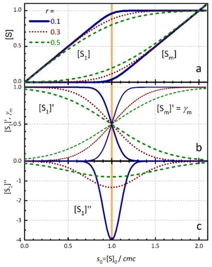 Surfactant concentration model. (a) Concentration of monomeric surfactant [S1] and of micellized surfactant [Sm] as function of the relative total surfactant concentration s0 = [S]0/cmc (Equations (5)–(8)) for three values of the relative transition width r (solid: r = 0.1, dot: r = 0.3, dash: r = 0.5). (b) First derivative [S1]′ = d[S1]/d[S]0 (Equation (9)) and (differential) degree of micellization γm = [Sm]′ = d[Sm]/d[S]0 (Equation (10)) (c) Second derivative [S1]″ = d2[S1]/d[S]02 (Equation (2)). The vertical thick line indicates the cmc. (Adapted with permission from [9]).