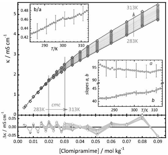 Figure 2. Conductivity of clomipramine hydrochloride (ClMP) in pure water as function of molal concentration and temperature. Black and grey diamonds: experimental data [37]. Grey and black lines: global fit of Equations (7) and (12) with r = 0.53 ± 0.04, the parameters indicated in the insets, and the cmc shown in Figure 3. Vertical grey lines: range of cmc values obtained from the fit. Right Inset: slopes a and b from the fit in units of mS cm−1 kg mol−1. Left Inset: slope ratio b/a. Lower panel: residuals of the fit.