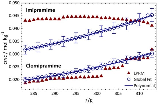 The temperature dependence of the cmc values (blue circles in Figure 3) shows now no discontinuities and is very similar for both drugs. The cmc values are relatively high (24 ± 1 × 10−3 mol kg−1 for ClMP and 38 ± 2 × 10−3 mol kg−1 for IMP, both at 298 K) and increase about 10 × 10−3 mol kg−1 in the studied 30 K temperature interval. The fit of a second order polynomial gives nearly identical values for both drugs, except for a constant offset (See Figure 2 and Table A1 in the Appendix A).