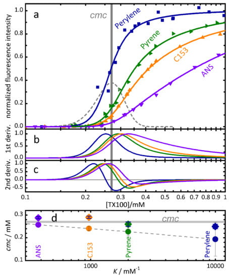 It is important to note that methods that define the cmc at the maximum of the first derivative or at the zero-crossing of the second derivative (or other similar criteria) of the fluorescence intensity will fail to report the correct cmc due to the unavoidable influence of the binding equilibrium, even for highly hydrophobic dyes such as perylene or pyrene. Panels (b) and (c) of Figure 4 show the first and second derivatives of the fluorescence intensities of panel (a). Neither the maxima nor the zero-crossings coincide with the cmc, nor will higher derivatives or other criteria defined directly based on these intensities.