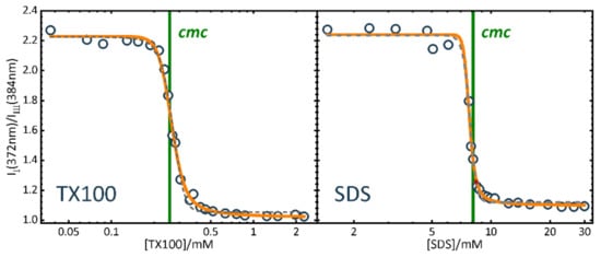 Yu et al. analysed the 1H chemical shifts of two cationic (CTAB, TTAB), one anionic (SDS), and a nonionic surfactant (TX100), both with Equation (18) and with the graphical method of intersecting straight lines and found good coincidence [47]. However, the rather surprising, apparent dependence of the cmc values on the position of the proton in the surfactant molecules may as well be an artefact due to the uncertainty in their cmc determination. The nonlinear fits of the concentration model yield not only the best estimate of the cmc but also the uncertainty of the estimation. Reporting the error intervals of the cmc values would have allowed one to assess the statistical significance of the variation they found.