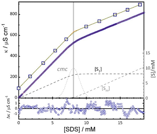 Conductivity of SDS in aqueous solution at 298 K. Full data set: the small circles are the 332 data points. The red solid line behind the circles indicates the fit of model Equation (12) to this data. Reduces data set: the big squares are 10 data points taken from the full data set and shifted upwards for better visibility. Orange continuous line and grey dashed line are fits of Equation (12) with fixed values r = 0.1 and 0.001, respectively. Dashed grey lines: concentrations [S1] and [Sm] from Equations (5) and (7). Dotted grey line: second derivative of [S1] (Equation (2)). Vertical grey line: cmc as given by the fit. Lower panel: residuals of the fit to the full data set. (Adapted with permission from [9]).