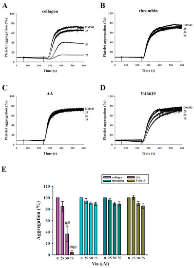 A turbidimetric method was applied to measure platelet aggregation [51] by using a Lumi-Aggregometer (Payton, Scarborough, ON, Canada). Platelet suspensions (3.6 × 108 cells/mL) were preincubated with various concentrations of vincristine (0–75 μM) or an isovolumetric solvent control (0.1% DMSO final concentration) for 3 min before the addition of agonists. The reaction was allowed to proceed for 6 min.
