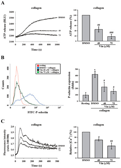 The flow cytometry method was applied as described previously [53]. In brief, 3.6 × 108 platelets/mL were preincubated with vincristine (40 and 75 µM) or 0.1% DMSO; subsequently, collagen was added for 20 min at 37 °C. After the reaction, platelets were fixed with 1% paraformaldehyde for 1 h at 4 °C, washed, and labeled with FITC–conjugated P-selectin antibodies for 30 min to detect the surface expression of P-selectin. After centrifugation and washing, platelets were suspended with 1 mL of phosphate-buffered saline and measured using a flow cytometer (FACScan system; BD Biosciences, San Jose, CA, USA). In the flow cytometry setting, platelets were gated based on the forward scatter and side scatter, and the number of events at 10,000 counts was stopped. All the experiments were performed at least three times to ensure reliability.