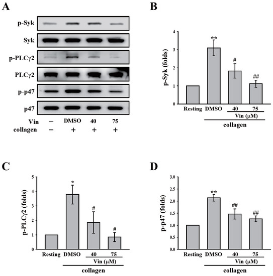 This method was performed as described previously [53]. In brief, platelet suspensions (1.2 × 109 cells/mL) were pretreated with vincristine (40 and 75 μM) or 0.1% DMSO for 3 min and then treated with collagen for 6 min to trigger platelet activation. The reaction was stopped, and the platelets were immediately resuspended in 200 μL of a lysis buffer for 1 h. Lysates were centrifuged at 5000× g for 5 min. Samples containing 80 μg of protein were separated through 12% sodium dodecyl sulfate–polyacrylamide gel electrophoresis; proteins were electrotransferred through semidry transfer (Bio-Rad Laboratories, Hercules, CA, USA). Blots were blocked with TBST (10 mM Tris-base, 100 mM NaCl, and 0.01% Tween 20) containing 5% BSA for 1 h and then probed with various primary antibodies. Membranes were incubated with the HRP-conjugated antimouse IgG or antirabbit IgG (diluted 1:3000 in TBST) for 1 h. Immunoreactive bands were detected using an enhanced chemiluminescence (ECL) system. The immunoreactive bands were developed by an ECL kit and analyzed by Celvin S (Biostep, Burkhardtsdorf, Germany). The bands were quantified by ImageJ 1.48v software (National Institute of Health, Bethesda, MD, USA).