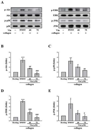 Effects of vincristine on collagen-mediated phosphorylation of Akt and MAPKs in human platelets. Washed platelets (3.6 × 108 cells/mL) were treated with vincristine (40 and 75 μM) or DMSO before collagen treatment (1 μg/mL). Protein extracts of platelets were subjected to Western blotting. The total and phosphorylated Akt, p38 MAPK, ERK, and JNK were detected using specific antibodies. Profiles in (A) are representative examples of three similar experiments. Data in (B–E) are presented as means ± standard error of the mean (n = 3). * P < 0.05, ** P < 0.01, and *** P < 0.001 compared with the resting group. # P < 0.05, ## P < 0.01, and ### P < 0.001 compared with the DMSO (solvent control) group.
