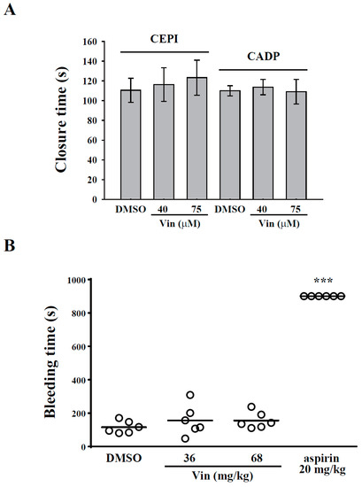 Mice were anesthetized with a mixture containing 75% air and 3% isoflurane and were maintained in 25% oxygen, and they were intravenously administered DMSO (solvent control) and vincristine (36 or 68 mg/kg) or aspirin (20 mg/kg, positive control) for 10 min. Immediately, bleeding was induced by severing the tail 3 mm from the tail tip, and the bleeding tail stump was immersed in saline. Subsequently, the bleeding time was continually recorded until no sign of bleeding was observed for at least 10 s. The dose for mice was converted from the dose for humans [55].