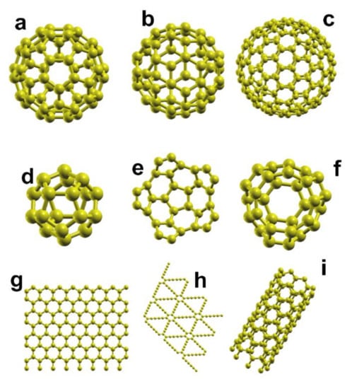 Since their discovery in 1985, the study of fullerenes and their exciting properties led to the subsequent discovery of many other carbon nanoforms: nanotubes, carbon onions, graphene, graphdiyne, carbon nanotori, etc., including hybrid nanostructures [1,2,3,4,5,6], see Figure 1 and Figure 2. As a result, there are numerous practical applications of carbon nanostructures, like gas sensors, adsorption of pollutant molecules, electric batteries, hydrogen adsorption, electronic devices, etc.