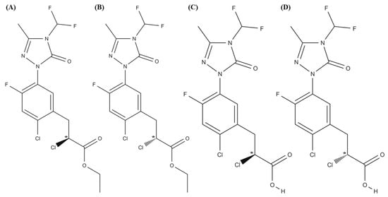 Structures of (A,B) carfentrazone-ethyl enantiomers; (C,D) carfentrazone enantiomers.