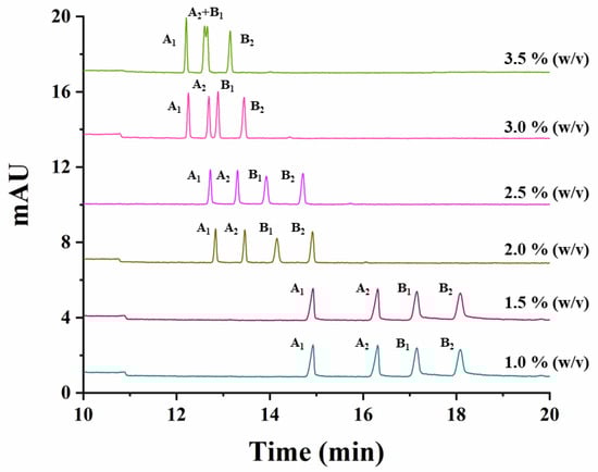 Electropherograms showing the effect of captisol concentration on the simultaneous separation of carfentrazone-ethyl and carfentrazone enantiomers using a standard solution containing 30 mg L−1 carfentrazone-ethyl racemate and 20 mg L−1 carfentrazone racemate with a 100 mM sodium acetate buffer (pH 5.0). Experimental conditions: uncoated fused-silica capillary, 58.5 cm (50 cm effective length × 50 µm i.d.); hydrodynamic injection: 50 mbar × 10 s; temperature: 20 °C; voltage: −20 kV; λ: 245 nm ± 4 nm. A1 and A2: carfentrazone-ethyl enantiomers. B1 and B2: carfentrazone enantiomers.