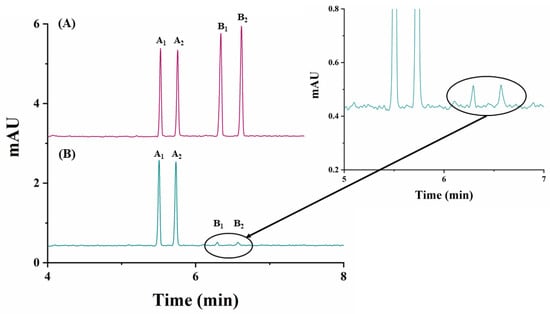 Electropherograms corresponding to the analysis of a carfentrazone-ethyl-based commercial agrochemical formulation using 25 mM sodium acetate buffer (pH 5.0)/2.5% (w/v) captisol, 30 °C and −30 kV. (A) Standard solution containing 30 mg L−1 of carfentrazone-ethyl racemate and 20 mg L−1 of carfentrazone racemate; (B) commercial herbicide formulation containing 30 mg L−1 of carfentrazone-ethyl racemate according to the label. Other experimental conditions as in Figure 2. A1 and A2: carfentrazone-ethyl enantiomers. B1 and B2: carfentrazone enantiomers.
