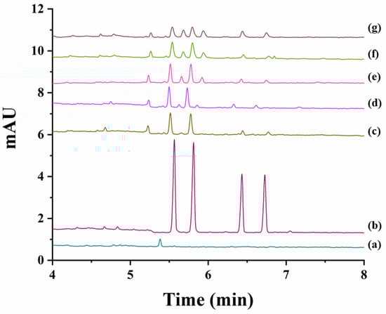 Electropherograms corresponding to the analysis of the extracts obtained from soil samples spiked with 40 mg L−1 carfentrazone-ethyl racemate (degradation study of carfentrazone-ethyl in soil samples). (a) Soil extract blank; (b) Standard solution of carfentrazone-ethyl racemate and carfentrazone racemate at 40 mg L−1 and 20 mg L−1, respectively; (c) soil extract after zero days; (d) soil extract after one day; (e) soil extract after three days; (f) soil extract after four days; (g) soil extract after seven days.