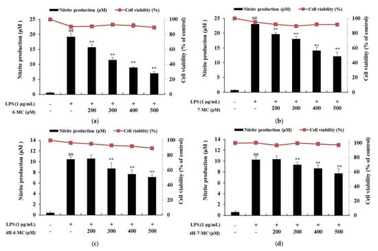 To examine the effect of coumarin derivatives on NO production, cells were pretreated with each coumarin derivative (200, 300, 400, and 500 μM) for 1 h and then stimulated for 24 h with LPS (1 μg/mL). The cells treated with LPS alone markedly induced NO production compared to the untreated control cells. However, NO production was significantly decreased by coumarin treatment in a concentration-dependent manner. In particular, 500 μM, which was the highest concentration tested, decreased the NO production level by 63.5% for 6-MC, 47.3% for 7-MC, 32.1% for 4H-6-MC, and 26.4% for 4H-7-MC, compared with the LPS alone-treated group (Figure 2a–d, ** p < 0.01).