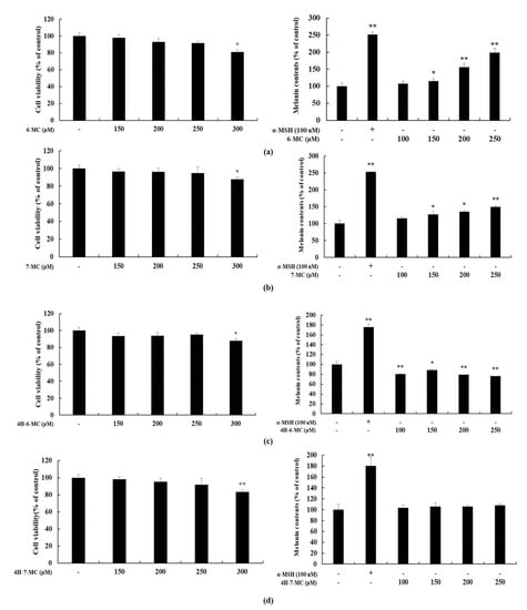 Effect of coumarin derivatives on proliferation and melanin contents in B16F10 cells. The cells were treated with various concentrations of coumarin derivatives for 72 h. α-MSH was used as the positive control. Proliferation and melanin contents of cells subjected to (a) 6-methylcoumarin (6-MC), (b) 7-methylcoumarin (7-MC), (c) 4-hydroxy-6-methylcoumarin (4H-6-MC), and (d) 4-hydroxy-7-methylcoumarin (4H-7-MC) treatment were expressed as percentages compared to the untreated control cells. The results are presented as the mean ± SD from three independent experiments. * p < 0.05, ** p < 0.01 versus untreated control cells.
