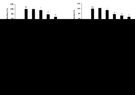 All experimental results are expressed as the mean ± standard deviation of three independent experiments. Statistical analysis was performed using the Student’s t-test. p-values < 0.05 (*) or 0.01 (**) were considered statistically significant.