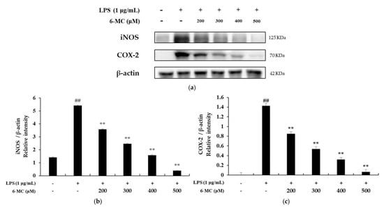 Recent studies have reported that NO and PGE2 production is regulated by iNOS and COX-2 protein expression [43,44]. Therefore, the expression of iNOS and COX-2 was confirmed by Western blotting to determine whether the expression of inflammatory mediators is related to the expression of iNOS and COX-2. As shown in Figure 4a, iNOS expression was increased 3.85-fold in cells treated with LPS alone compared to that in untreated control cells. However, it was decreased by 33.8%, 54.52%, 70.79%, and 92.79% at 6-MC treatment concentrations of 200, 300, 400, and 500 μM, respectively (Figure 5a, ** p < 0.01). In addition, COX-2 expression was increased by 35.7-fold in the LPS alone-treated group compared with untreated control cells, and it was decreased by 40.8%, 62.7%, 78.2%, and 95.78%, respectively (Figure 5b, ** p < 0.01), in the presence of 6-MC (200, 300, 400, and 500 μM) (Figure 4b). Therefore, the results suggest that 6-MC suppresses the production of NO and PGE2, which are inflammatory mediators, through inhibition of iNOS and COX-2 protein expression, respectively.