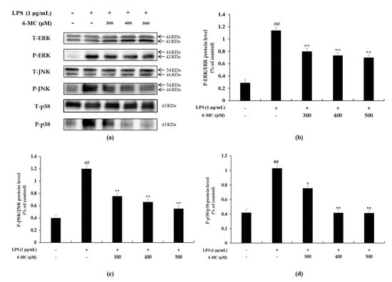 It has been reported that LPS stimulates TLR4 on the surface of macrophages to induce phosphorylation of MAPK (extracellular signal regulated kinase; ERK, c-Jun N-terminal kinase; JNK, p38) to activate a cell signaling pathway and increase the expression of various inflammatory cytokines [11,12,13]. Therefore, Western blotting was performed to confirm whether the inhibitory effect of 6-MC on inflammatory cytokine expression was due to the inhibition of MAPK phosphorylation. As shown in Figure 6, there was significant phosphorylation of ERK (4.1-fold), JNK (3.1-fold), and p38 (2.5-fold) in cells treated with LPS alone compared to untreated control cells. It was also confirmed that LPS-stimulated phosphorylation of ERK, JNK, and p38 was attenuated by 6-MC treatment in a concentration-dependent manner. In particular, 500 μM, which was the highest treatment concentration, markedly decreased ERK, JNK, and p38 phosphorylation levels by 38.9%, 53.8%, and 59.7%, respectively, compared with the LPS alone-stimulated group (Figure 6b–d, ** p < 0.01). Thus, the results suggest that 6-MC suppresses inflammatory cytokine expression by blocking MAPK phosphorylation.