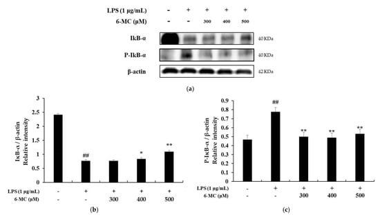 Effect of 6-MC on the protein expression level of P-IκB-α and IκB-α in LPS-induced RAW 264.7 cells. (a) Result of Western blotting, and protein level of (b) IκB-α and (c) P-IκB-α. Lysates were prepared from cells pretreated with 6-MC (300, 400, and 500 μM) for 1 h and then treated with LPS (1 μg/mL) for 20 min. β-actin was used as a loading control. Total cellular proteins were separated using SDS-PAGE, transferred to PVDF membranes, and detected using specific antibodies against phospho-IκB-α, IκB-α, and β-actin. The results in the graphs are presented as the mean ± SD from three independent measurements using the ImageJ program. ## p < 0.01 vs. untreated control group. * p < 0.05, ** p < 0.01 versus group treated with LPS alone.