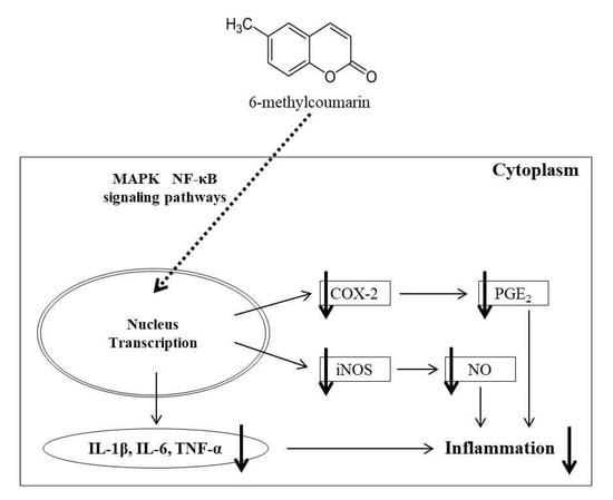 6-Methylcoumarin (6-MC), 7-methylcoumarin (7-MC), 4-hydroxy-6-methylcoumarin (4H-6-MC), 4-hydroxy-7-methylcoumarin (4H-7-MC), dimethyl sulfoxide (DMSO), radioimmunoprecipitation assay (RIPA) buffer, Griess reagent, sodium nitrite, protease inhibitor cocktail, and phosphate buffered saline (PBS) were obtained from Sigma-Aldrich (St. Louis, MO, USA). Lipopolysaccharides derived from Escherichia coli (LPS) and 3-(4,5-dimethylthiazol-2-yl)-2,5-diphenyltetrazolium bromide (MTT) were obtained from VWR (Radnor, PA, USA). Dulbecco’s modified Eagle’s medium (DMEM), fetal bovine serum (FBS), penicillin/streptomycin, and nuclear and cytoplasmic extraction reagents (NCER) were obtained from Thermo Fisher Scientific (Waltham, MA, USA). Tris-buffered saline (TBS) and enhanced chemiluminescence (ECL) kits were obtained from Biosesang (Seongnam, Gyeonggi-do, Korea). The following antibodies were used: β-actin, anti-iNOS, anti-COX-2, T-IκBα, p-IκBα, T-ERK, p-pERK, T-JNK, p-JNK, T-p38, and p-p38. They were obtained from BD Biosciences (San Diego, CA, USA). The interleukin-6 (IL-6), interleukin-1β (IL-1β), prostaglandin E2 (PGE2), and tumor necrosis factor (TNF-α) ELISA kits were obtained from R&D Systems Inc. (St, Louis, MO, USA). The protein levels were quantified and graphed using the ImageJ program (NIH, Bethesda, MD, USA). All reagents used above were of analytical grade.