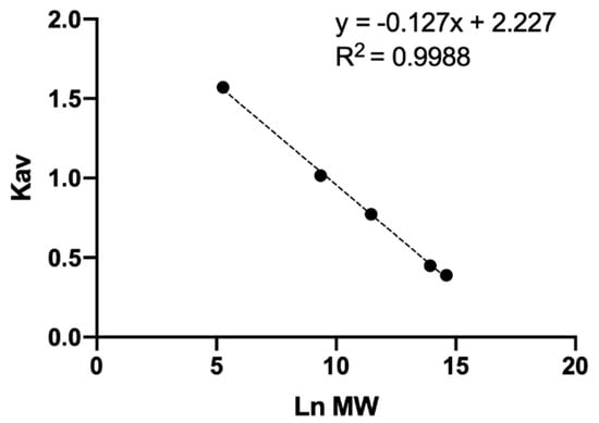 Generally, when talking about a polymer, reference is made to a molecular weight distribution, this represents to count the real number of molecules that have the average molecular weight and how many have a higher or lower size, with this information molecular distribution curves are generated [48]. To evaluate the molecular distribution of unknown samples, the partition coefficient ( of four standards of different average MW and D-glucuronic acid (monomer) was calculated. The represents the fraction of stationary phase available for a given solute and is directly related to the size of the molecule and is independent of the column used so it is often used in analytical curves instead of the retention time [36,38,48]. To determine the it was necessary to calculate the exclusion volume (6.87 mL), total retention volume (13.75 mL), total column volume (14.34 mL), and void retention time (6.00 min) of the Ultrahydrogel 2000 column [36,38,48]. An analytical curve was developed to correlate with the natural logarithm (Ln) of average MW (Figure 1). Multiple and adjusted coefficients of determination of 0.9988 and 0.9984 respectively showed a linear dependence among and Ln MW. This analytical curve allowed the calculation of the average MW of the unknown samples.