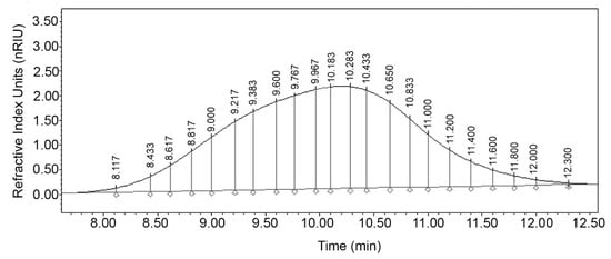 To determine the fraction corresponding to the DP of HA with a specific molecular weight in the chromatogram, the theoretical retention time () was calculated with the Equation (7) according to Moreno-Vilet, Bostyn, Flores-Montano and Camacho-Ruiz [48]: