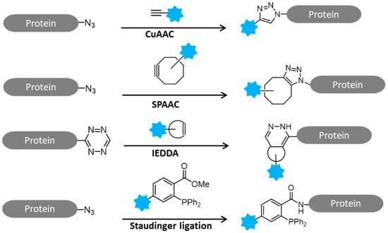 - Parker, C.G.; Pratt, M.R. Click Chemistry in Proteomic Investigations. Cell 2020, 180, 605–632. [Google Scholar] [CrossRef]