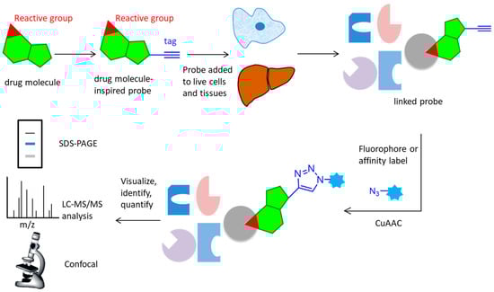 Over the past few years, activity-based protein profiling (ABPP) has become a strong method of chemical proteomics for analyzing proteins’ functional states within a complex proteome [6,7]. ABPP strategies usually use activity-based probes (ABPs), that are designed to be recognized by the target protein and react with residues from the active site, which can efficiently enrich and identify of low-abundance and low-affinity probe-interacting proteins [8]. Many ABPs have been developed for many classes of enzymes, including serine hydrolases [9,10], cysteine proteases [11], metallohydrolases, phosphatases, deubiquinating enzymes [12,13], kinases [14,15], various oxidoreductases, and others. Although ABPs often utilize reporter groups for the direct enrichment or visualization of labeled proteins, avoiding the need for additional conjugation steps, such bulky groups can hamper cellular uptake and tissue distribution, potentially limiting their application in living systems. To improve these problems, compound-centric chemical proteomics approach on the basis of click reactions were used to enrich and identify enzyme targets, which allow for the incorporation of chemical groups with highly selective reactivity into small molecules, or protein modifications without perturbing their biological function, enabling the selective installation of an analysis tag for downstream investigations (Figure 2). The probe is designed based on the structure of the active molecule, then added to live cells or tissues. It reacts covalently (via an electrophilic trap or a photo-crosslinking group) or non-covalently with the target protein. The lysed samples subject to CuAAC reaction attach a fluorophore, affinity label, or a combination of these elements. Marked proteins are subsequently visualized, identified or quantified using a variety of techniques, such as SDS-PAGE, LC-MS/MS analysis or confocal imaging [8]. The CuAAC-enabled ABPs were developed for protein arginine deiminases [16]; ubiquitin mechanisms [12,17], cytochrome P450 enzymes [18], glycosidases [19], and kinase [20,21].