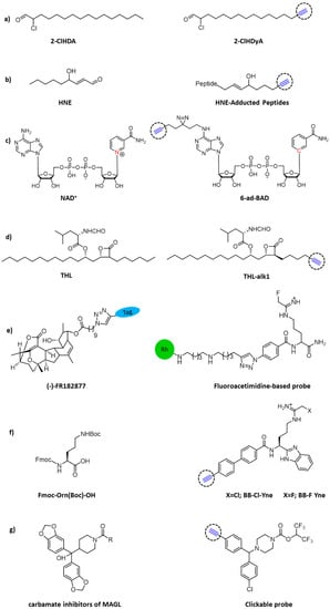 Chemical structures of clickable probes in ABPP for identifying protein targets of: (a) 2-ClHDA, (b) HNE, (c) NAD+, (d) THL, (e) natural product (-)–FR182877, (f) Cl- and F-amidine, and (g) carbamates.