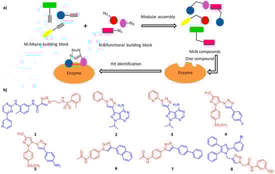 Protein kinases catalyze the phosphorylation of serine, threonine, tyrosine and histidine residues of proteins. Aberrant kinases expressions are involved in numerous illnesses, including inflammation and cancers [66]. Kalesh and colleagues recently used click chemistry to produce 344 Abelson tyrosine kinase (Abl) inhibitors [67]. Later inhibition screening assays showed that Abl kinase had a preference for short chain azide scaffolds, then 11 lead compounds with moderate potency were found. Among them, compound 1 is the most potent hit during screening with IC50 = 700 nM (Figure 5b). Similarly, Klein and colleagues used this strategy to produce Plasmodium falciparumprotein kinase 7 (PfPK7) inhibitors [68]. The researchers used alkyne/azide-derivatized purine analogs to click on various aromatic azides/alkynes, and subsequent inhibition screening assays resulted in two potent PfPK7 inhibitors (compound 2 and 3, Figure 5b) with IC50 at 10–20 μM.