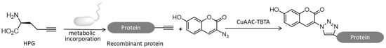 Although CuAAC has a variety of ligands, these reactions are mainly limited to cell surface markers [79]. The direct labeling of intracellular biomolecules remains to be explored to a great extent. Beatty and colleagues reported for the first time the utility of the CuAAC reaction for labeling newly synthesized proteins in bacteria (Figure 6). Escherichia coli cells were treated with 19 kinds of natural amino acids and alkyne functionalized unnatural amino acid, homopropargylglycine (HPG), to prepare recombinant protein Bastar with alkyne group. Previous work has demonstrated that alkynyl amino acids can be incorporated easily into recombinant proteins in a residue-specific manner. HPG serves effectively as a methionine (Met) surrogate even without modification of the translational machinery of the host. Then, the bacterial cells were treated with tris (benzyltriazolylmethyl) amine (TBTA) and azide functionalized coumarin at 4 °C for 14 h for CuAAC reaction. After a large amount of washing, cells were stimulated at 395 nm, and the fluorescent emission was monitored. Only when HPG, azido-coumarin and Cu (I) TBTA were co-incubated the cells, the fluorescence intensity increased significantly. Confocal fluorescence microscopy and polyacrylamide gel electrophoresis confirmed the successful labeling of the Bastar protein in E. coli [80].