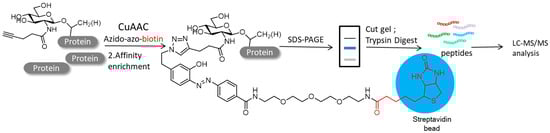 Among the different PTMs, protein glycosylation regulates important mechanisms associated with cellular communication, which plays a major role in immune reactions, inflammation and cancerous metastases [5]. Some studies have reported a mutant galacytosyltranferase which can transfer an N-azidoacetylgalactosamine (GalNAz) residue onto O-GlcNAc modified proteins, therefore the bio-orthogonal reaction provided an elite chemical method for glycomics studies [82,83]. Zaro and colleagues exploited click reactions to isolate and identify glycosylated proteins. Specifically, they demonstrated the metabolic intake of N-acetylglucosamine analog GlcNAlk on O-GlcNAcylated proteins in NIH-3T3 cells. After lysing in SDS, the azido-azo-biotin was applied to the soluble proteins, followed by enrichment with streptavidin beads. The biotinylated proteins were then released upon sodium dithionite treatment and separated with SDS-PAGE (Figure 7). Ultimately, the LC-MS resulted in the identification of 374 proteins modified by GlcNAlk [84].