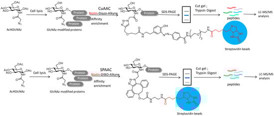 - Li, S.; Zhu, H.; Wang, J.; Wang, X.; Li, X.; Ma, C.; Wen, L.; Yu, B.; Wang, Y.; Li, J.; et al. Comparative analysis of Cu (I)-catalyzed alkyne-azide cycloaddition (CuAAC) and strain-promoted alkyne-azide cycloaddition (SPAAC) in O-GlcNAc proteomics. Electrophoresis 2016, 37, 1431–1436. [Google Scholar] [CrossRef] [Green Version]