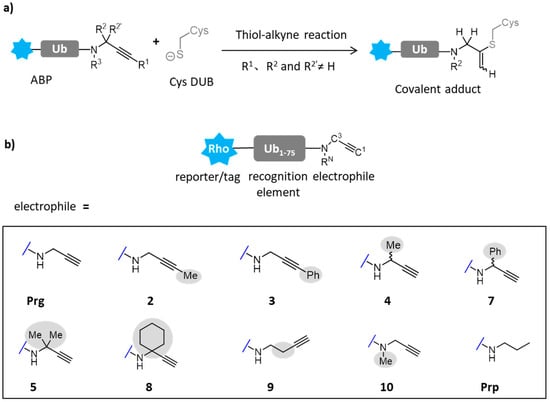 As a common post-translational modification, ubiquitination can regulate a variety of protein substrates in different cellular pathways [86]. Meanwhile, deubiquitinating enzymes (DUBs) realize the process of deubiquitination by cutting the isopeptide bond between the C-terminal of ubiquitin and the lysine residue of the target protein, or by polymerizing the isopeptide bond between the distal and proximal ubiquitin of the ubiquitin chain. The unactivated terminal alkynyl group in active probes is considered as a standard reaction site for labeling cysteine deubiquitinating enzymes (Figure 9a). These probes are widely used to monitor the activity of DUBs in infection, disease and treatment, or to discover new DUBs and their active cysteine. Mons and colleagues have designed a series of probes to study the reactivity of terminal alkynyl groups towards DUBs (Figure 9b). The core of the probes is rhodamine linked to the total synthesized ubiquitin1–75(Ub1–75). Different reaction groups were attached to the carbon end of ubiquitin, in which 2 and 3 are replaced by methyl and phenyl, respectively. In order to study the importance of terminal protons, the substitution at C3 makes the volume of the probe larger (4, 7). Propionamide served as a negative control because it had no reactive group. The possibility of thiol alkynyl click reaction targeting deubiquitinating enzymes in cells was studied. Moreover, the target range of propargyl derivatives targeting cysteine was extended from terminal alkynyl to internal substituted alkynyl [87].