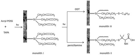 Polyhedral oligomer silsesquioxane (POSS) is a hybrid material with cage-like structure and nanoscale size [100,101]. The inherent properties of POSS, such as good resistance to temperature/oxidation and an excellent tolerance to pH, make it appropriate to prepare a new type of monolith column [102,103]. Ma and colleagues reported a pure POSS-based hybrid monolithic column (Figure 10), which was prepared by self-polymerization of acrylate (monolith I) with acrylopropyl polyoctahedral silsesquioxane (acryl-POSS) as crosslinking agent and 3-(triallyl silyl) propyl acrylate (TAPA) as a monomer. As a result, monolithic column I can be further modified by thiol-ene click reaction with penicillamine (monolithic II) and 1-octadecanethiol (monolithic III). The three monolithic columns were characterized and then applied to the separation of various small molecules and the determination of trypsin digestion solution of HeLa cells by reciprocal liquid chromatography [104].