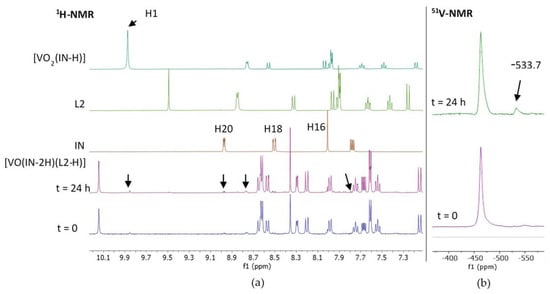 (a) 1H-NMR of [VVO(IN-2H)(L2-H)] in DMSO-d6 (23.5 mM) at t = 0 and 24 h, compared with 1H-NMR spectra of free ligands and [VVO2(IN-H)]. Selected signals were labeled and pointed with an arrow in the spectra of the heteroleptic complex. (b) 51V-NMR of [VVO(IN-2H)(L2-H)] in DMSO-d6 (23.5 mM) at t = 0 and 24 h.
