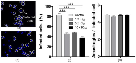 In order to investigate the effect of the most active compound of the series on the parasite’s infection process, cell-derived trypomastigotes were incubated for 30 min with [VVO(IN-2H)(L2-H)] in concentrations of 1 ×, 5 × and 10 × the IC50 value previously determined on cell-derived trypomastigotes (Table 1). Pre-treated trypomatigotes were then used to infect VERO cells. The number of infected cells was evaluated after 24 and 48 h for each treatment and compared with control cells infected with untreated trypomastigotes (Figure 4a–c). After both tested times, the percentage of infected cells decreases statistically significantly. The effect tends to be dose-dependent after 48 h post-infection with treated trypomastigotes.