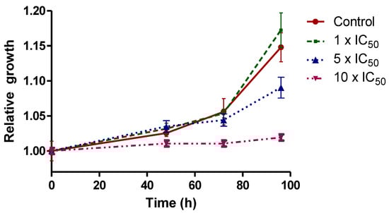 Similar parasite growth recovery profiles were observed in untreated parasites and parasites treated with the two lowest doses, suggesting a trypanostatic effect at these concentrations. On the other hand, for the 10 × IC50 treatment, a trypanocide effect could be suggested, since treated parasites could not recover the growth profile even after 96 h of recovery in fresh medium without compound (Figure 5).