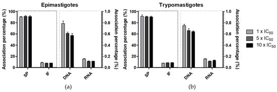 Vanadium associated with macromolecules was determined in order to analyze the subcellular distribution of the chosen compound, [VVO(IN-2H)(L2-H)], in the parasites. Epimastigotes and trypomastigotes were incubated for 24 h with the VVO-complex and then, different macromolecules (DNA, RNA and proteins) were isolated and total vanadium associated with each fraction was quantified by electrothermal atomic absorption spectrometry (Figure 6).