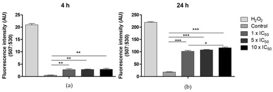 All compound concentrations tested, increased significantly ROS levels compared to the control group (Figure 7). After 24 h a statistically significative increase in ROS production was also observed between the 1 × and 10 × IC50 concentrations.