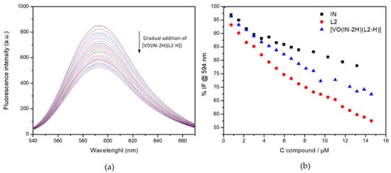 Under our experimental conditions, the emission maximum of the {DNA–EB} adduct is located at 594 nm. At the selected excitation wavelength, no fluorescence emission occurs from the direct interaction of [VVO(IN-2H)(L2-H)] or L2 and IN free ligands with DNA. A negligible emission at 594 nm was found due to direct interaction of the compounds with DNA, which was subtracted from the sample spectra. Complex and free ligands affect the emission of the {DNA–EB} adduct. A regular quenching in the emission of {DNA–EB} is observed upon increasing the concentration of the studied compounds, the extent of the quenching being of a similar order for IN, L2 and [VVO(IN-2H)(L2-H)] complex (Table 3). Changes in emission spectra of {DNA–EB} adduct while [VVO(IN-2H)(L2-H)] is gradually added are shown in Figure 8a as an example. Comparative results of the titration with the tested compounds are shown in Figure 8b.
