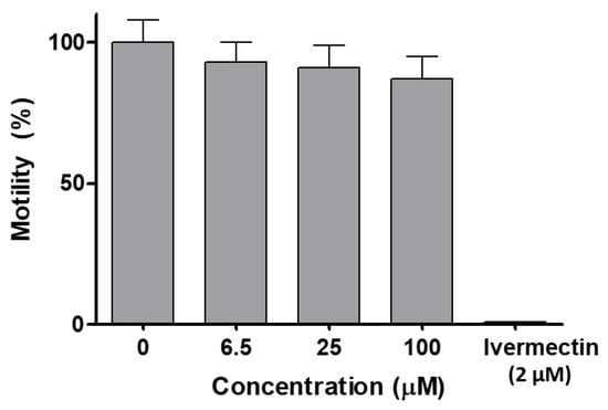 Seventy L4 adult worms were incubated in M9 buffer, 1% DMSO and the vanadium compound at different concentrations (6.25–100 µM range). Vehicle control (without compound) was used as a reference of normal motility in 1% DMSO. Ivermectin was used as a positive control at 2 µM. In each experiment, four replicas were performed for each concentration. One experiment of three biological replicates is shown. The experiment was performed twice. Error bars correspond to standard deviations.