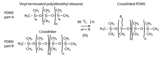 Structure of the polydimethylsiloxane (PDMS): pre-polymer (PDMS part A) and crosslinker (PDMS part B). The crosslinked structure of the polymer (right) is obtained after the alkane reacts with the silicon hydride under the influence of the platinum as a catalyst [].