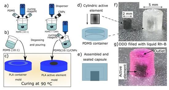 Drug delivery device based on polydimethylsiloxane nanocomposites: (a) synthesis of the PDMS/CNPs nanocomposites; (b) degassing and pouring of the polymers within the poly(lactic acid) PLA molds; (c) curing process to obtain the containers and the active elements; (d) assembling of the containers and active elements; (e) assembled and sealed capsule ready to be filled with Rh-B; (f) image of a real active element and PDMS container; and (g) image of a real DDD filled with Rh-B.