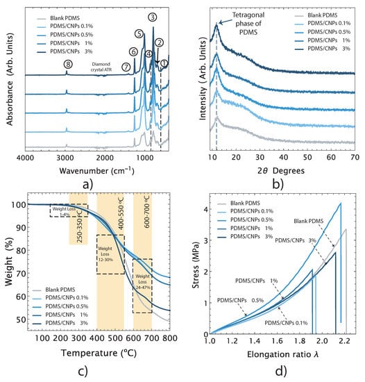 Figure 3a shows the FT-IR spectra of the blank PDMS and its nanocomposites and the bands assignations have been summarized in Table 1. The origins of each of these bands are listed in the table along with the references of previous reports on these features with similar nanocomposites. The registered FT-IR spectra show that the addition of CNPs in the polymer does not significantly affect its chemical structure, suggesting that the interactions between the nanoparticles and the PDMS matrix are only physical. Therefore, the inclusion of CNPs might have an impact on important features of the PDMS/CNPs nanocomposite such as its crystallinity, thermal stability, and/or stiffness.