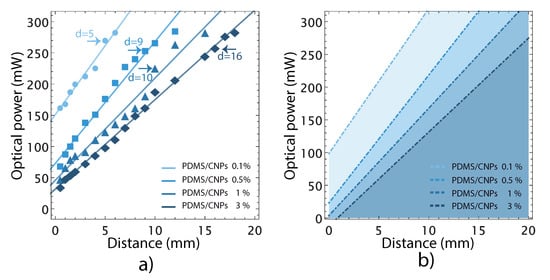 The PDMS nanocomposites absorb NIR radiation and under some conditions the increase in temperature can lead to incandescence. Figure 4a presents optical powers for different irradiation distances registered for each sample. The experimental points represent the maximum optical power, for a given distance that the samples can withstand before incandescence. Optical powers beyond these levels damaged the nanocomposites. For each PDMS/CNPs nanocomposite (0.1%, 0.5%, 1% and 3%), we were able to identify an optimum irradiation distance for reaching maximum deformation before incandescence (d = 5, d = 9, d = 10, d = 16 mm, respectively), as marked in Figure 4a. As shown in the plot, larger irradiation distances are allowed for the nanocomposites with higher CNPs concentration to observe the photomechanical effect. Using these results, we defined the working regions for each nanocomposite upon obtaining a linear fit for the experimental points. The straight lines thus define the optical powers that can be safely used for a given irradiation distance avoiding incandescence. Since some experimental points might fall below these safety lines, an additional safety factor was considered using the residuals of the fitting. Hence, the safe working regions shown in Figure 4b were established upon considering irradiation powers 20% below than those originally observed for each nanocomposite. The shaded regions in the figure thus indicate the ranges of optical powers and irradiation distances that would avoid thermal damage and incandescence for each PDMS/CNPs nanocomposite.
